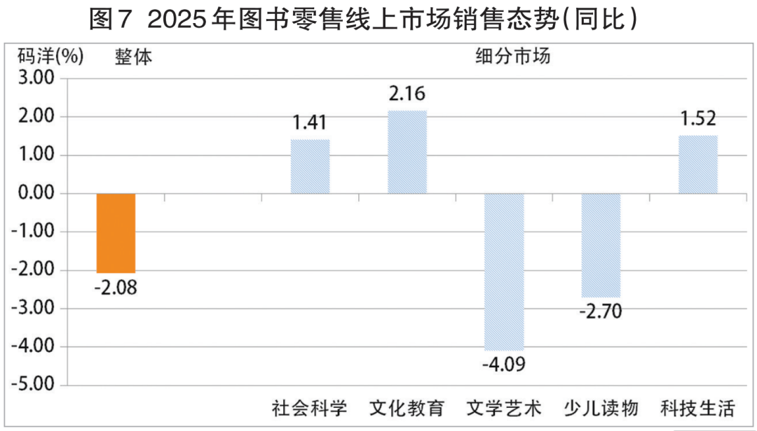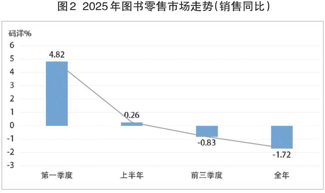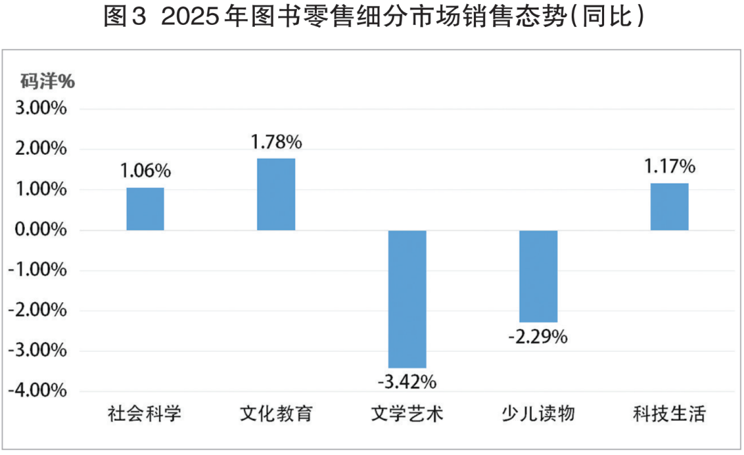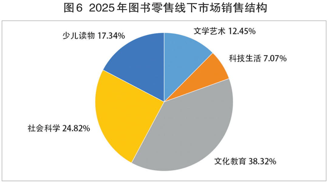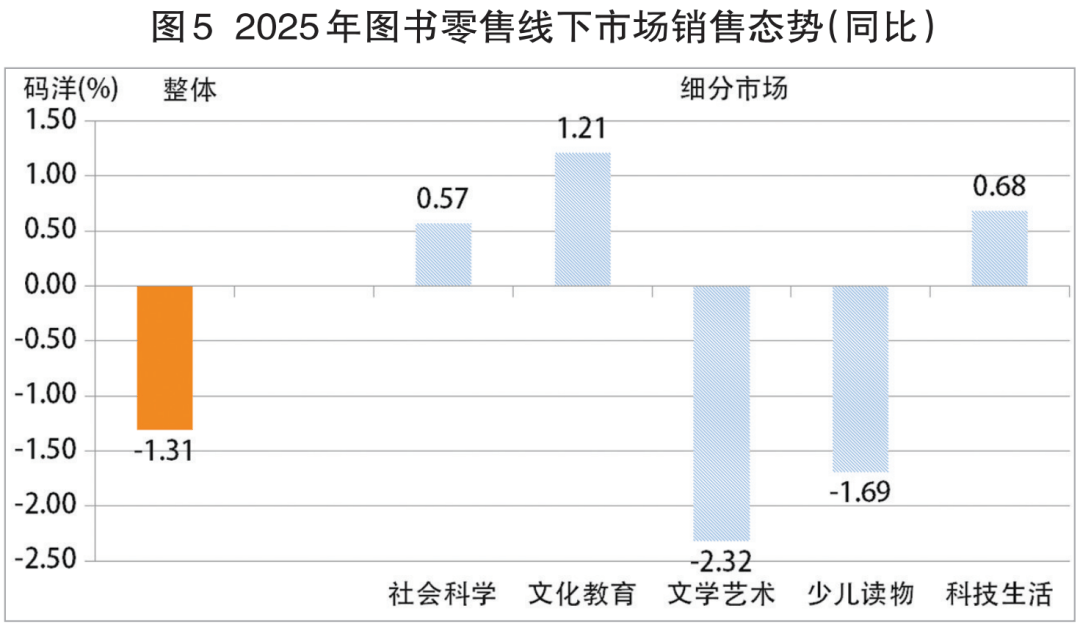 据基于“国度出书刊行消息公共办事平台”的发卖数据和商报·奥示“中国出书业市场监测系统”线下ERP数据、线月份发卖再度下滑,致使全年呈现6个月发卖上升、6个月发卖下降的不相上下场合排场。只是因为发卖升幅小于发卖降幅,终至昔时图书零售正在“十四五”收官之际,回溯过去5年,图书零售履历了新冠疫情期间先下降,再回升,又下降的较大震动后,从2023年起市场进入小幅震动阶段——市场回升、回落约正在1%摆布,年度间差别不脚1个百分点,5年市场全程呈两年回升、三年回落的螺旋走势(见图1)。5年间,正在新冠疫情沉创、学生市场萎缩、新手艺冲击日甚的大布景下,图书零售呈总体微幅下行,市场韧性犹存形态,显示了业界的集体抗压奋争,实属不易。 正在“十五五”开局之际,跟着《全平易近阅读推进条例》的公布实施和“全平易近阅读勾当周”的设立,“春风已到玉门关”,有来由相信“十五五”开局之年的图书零售会有一个非统一般的回升,出书业将顺势而为,打赢一场图书零售“翻身仗”。从2025年的图书零售市场走势(见图2)可见:图书市场发卖回落次要发生鄙人半年。开年首月,虽然发卖同比下降,但2、3月份持续两个月发卖回升,致使第一季度实现4。82%的市场回升。4月份,市场再度回升后,虽然5、6月份持续两个月发卖同比下降,但因为第一季度升幅的牵拉,至上半年终结市场仍连结了0。26%小幅上行。下半年虽然7、8月份持续两个月市场回升,但因为正在年度分量最沉的开学季9月份发卖下降,导致前三季度终结,市场呈0。83%的微幅回落;第四时度首月10月份市场沉现回升,不意11、12月持续两个月市场再次回落,12月份的图书零售同比下降 6。93 %,使2025年的图书零售“功亏一篑”,再陷同比回落——实是一个盘曲崎岖、变化莫测的年度市场。 虽然2025年图书零售全体市场规模同比回落,但各细分市场规模却起落纷歧(见图3)。三类细分市场规模扩大:文化教育书细分市场规模增幅第一,发卖同比增加1。78%,科技糊口书细分市场规模增幅次之,发卖同比增加1。17%;社会科学书细分市场规模增幅最小,发卖同比增加1。06%。两类细分市场规模收缩:少儿读物细分市场规模降幅小,发卖同比下降2。29%;文学艺术书细分市场规模降幅稍大,发卖同比下降3。42%。文教、社科、科技三类细分市场虽然增幅均不大,但终究是正在全体市场规模收缩下的柳暗花明。 2025年图书零售市场的发卖布局(见图4)是:少儿读物类市场份额最大,占比24。91%,比沉同比缩小0。13个百分点;文化教育类市场份额次之,占比24。63%,比沉同比扩大0。69个百分点;社会科学类市场份额居中,占比22。93%,比沉同比扩大0。35个百分点;文学艺术类市场份额第四,占比19。41%,比沉同比缩小1。16个百分点;科技糊口类市场份额最小,占比8。12%,取上年同期比力:各类别市场份额位序不变。文化教育类、社会科学类、科技糊口类市场份额别离同比扩大,取其各自年度发卖别离同比增加相吻合;少儿读物类、文学艺术类市场份额别离同比缩小,取其各自年度发卖别离同比下降相吻合。少儿读物类虽然仍为市场最大份额,但比沉缩小,发卖下降,印证了童书市场态势的严峻;文化教育类因为刚需成分支持,比沉扩幅、发卖增幅排列之首;社会科学类比沉、发卖同增,取相关从题时政图书超凡热销不无关系;文学艺术类做为市场化程度最高的品类,比沉、发卖均降,注释了受众需求多元生变对市场的冲击;科技糊口类比沉、发卖双增,折射了健康、丰美的高质量糊口愈加成为的第一逃求。全景洞察:2025年图书零售市场全体趋稳健运转,未有大的异动发生。市场收官的12月份,图书零售市场发卖数量同比下降8。04%,环比下降16。23%;发卖码洋同比下降6。93%,环比下降14。97%。由此,致第四时度发卖数量同比下降5。73%,环比下降4。28%;发卖码洋同比下降4。42%,环比下降3。11%。2025年图书零售线下市场取全体市场相仿,同呈微幅回落:发卖数量同比下降2。21%,发卖码洋同比下降1。31%,降幅别离窄于全体市场。线下细分市场态势取全体细分市场千篇一律,同为三升两降(见图5),且起落均为一位数。三类细分市场规模扩幅接近:文化教育书细分市场规模扩幅居首,发卖同比增加1。21%;科技糊口书细分市场规模扩幅次之,发卖同比增加0。68%;社会科学书细分市场规模扩幅第三,发卖同比增加0。57%。两类细分市场规模收缩,且降幅接近:文学艺术书市场发卖同比下降2。32%;少儿读物细分市场发卖同比下降1。69%。扩大和缩小的细分市场取全体细分市场不异。 2025年图书零售线下市场的发卖布局(见图6)是:文化教育类市场份额居首,占比38。32%,比沉同比扩大0。03个百分点;社会科学类市场份额次之,占比24。82%,比沉同比扩大0。04个百分点;少儿读物类市场份额居中,占比17。34%,比沉同比缩小0。58个百分点;文学艺术类市场份额第四,占比12。45%,比沉同比缩小0。04个百分点;科技糊口类市场份额居末,占比7。07%,比沉同比扩大0。55个百分点。取上年同期比力:各类别市场份额位序不变,比沉变化均不脚一个百分点。 12月份,图书零售线下市场发卖数量同比下降3。78%,环比下降9。86%;发卖码洋同比下降2。39%,环比下降8。92%。致使第四时度发卖数量同比下降5。65%,环比下降10。69%;发卖码洋同比下降4。75%,环比下降9。87%。2025年,图书零售线下区域市场态势稍优于上年,发卖增加